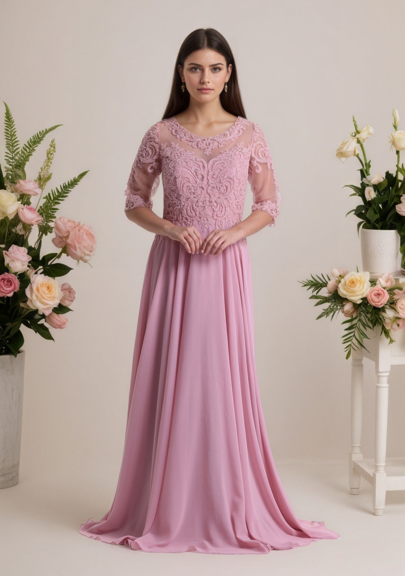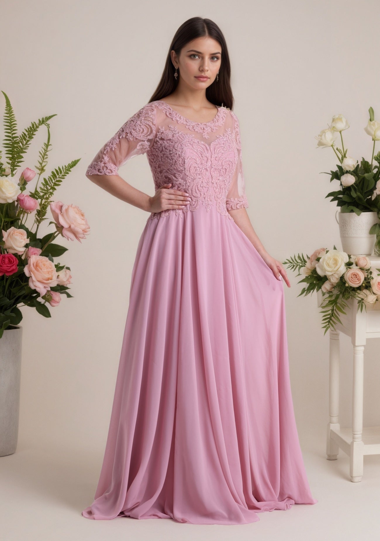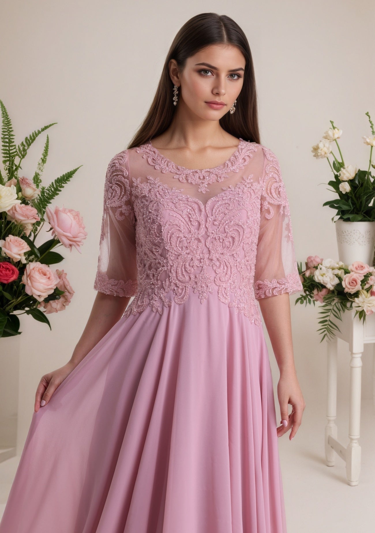 A-line Scoop Neck Half Sleeve Floor Length Chiffon Mother of the Bride Dress
