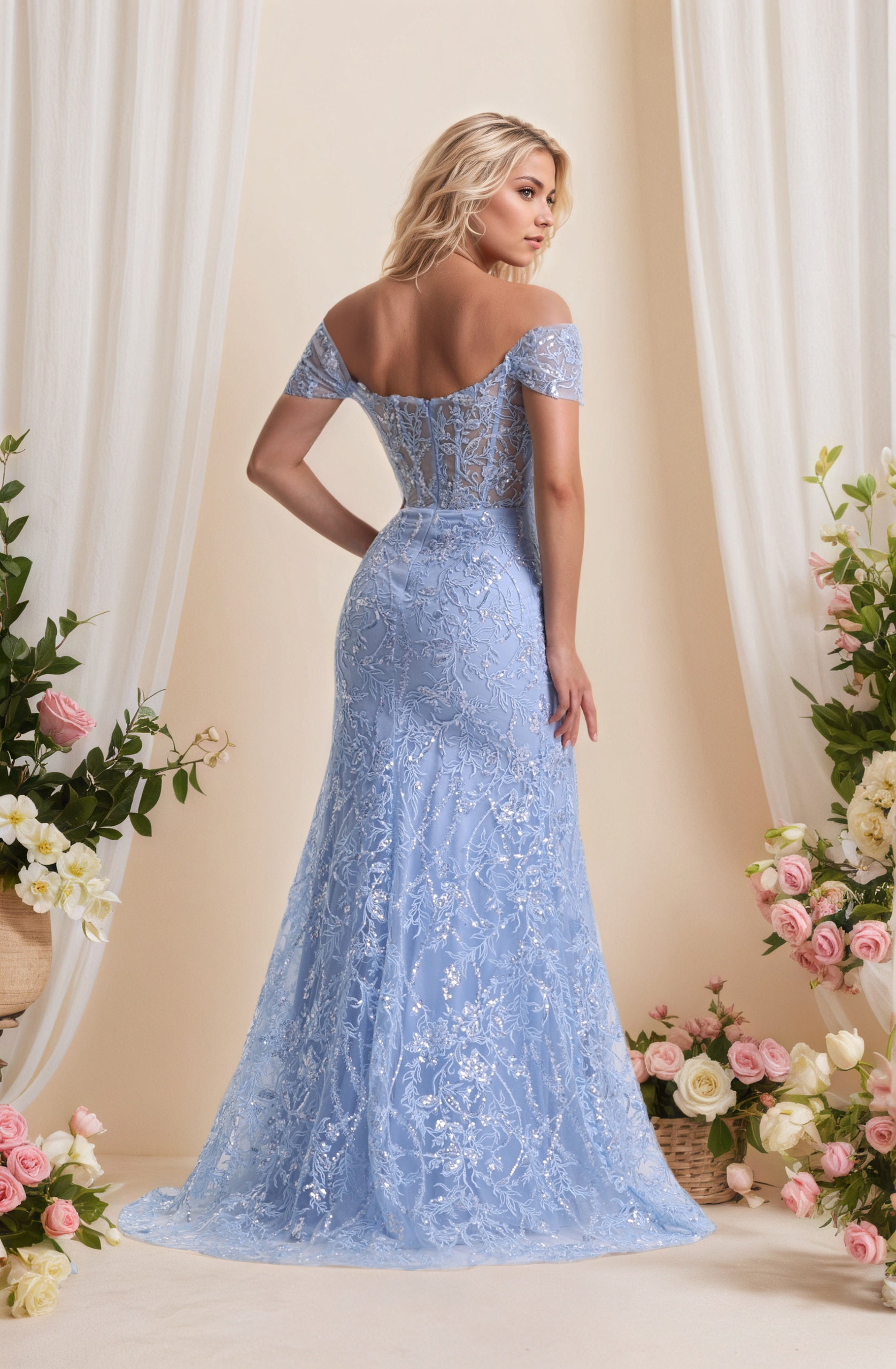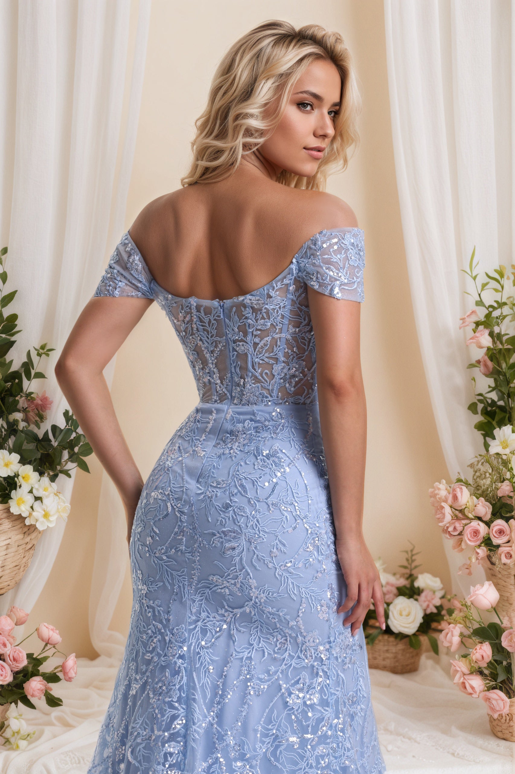 Dusty Blue Sequined Off Shoulder Lace Up Homecoming Dress