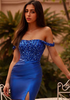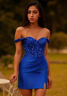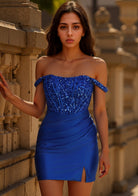 Royal Blue Sequined Off Shoulder Backless Homecoming Dress