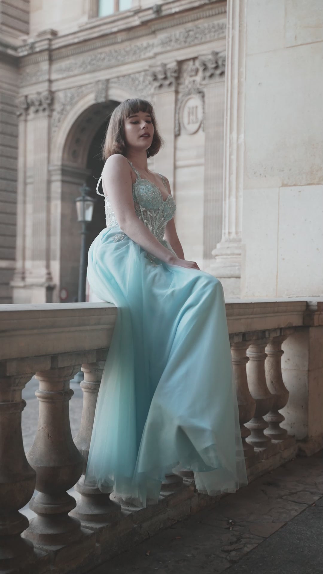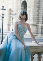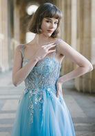 Aqua Blue Corset Prom Dress Tulle A-Line Gown with Beaded Detail & Open Back