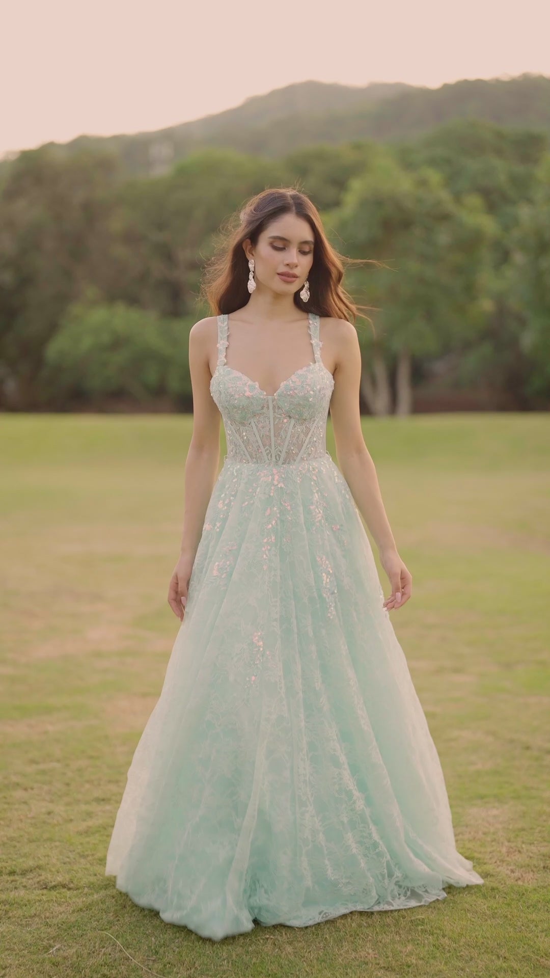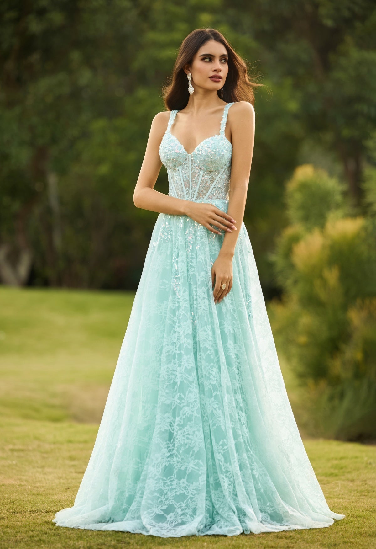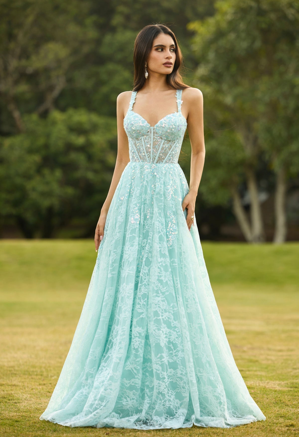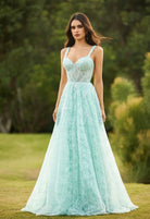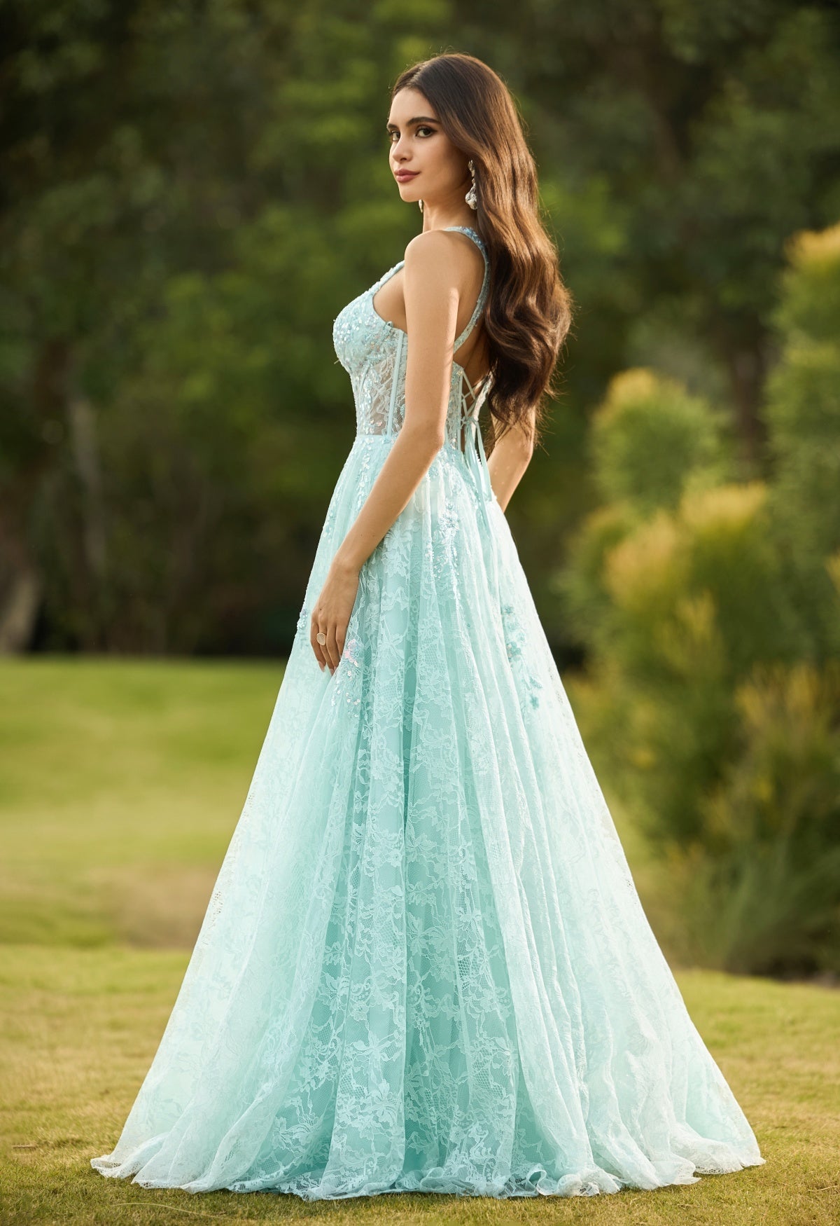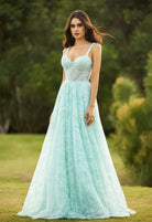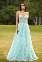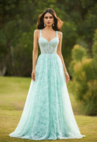 Aqua Blue Lace A-Line Prom Dress with Embellished Corset Bodice & Lace-Up Back